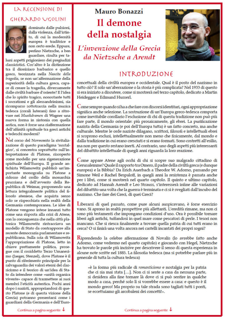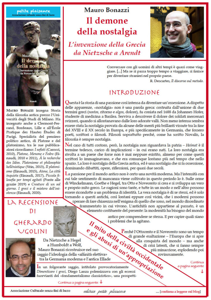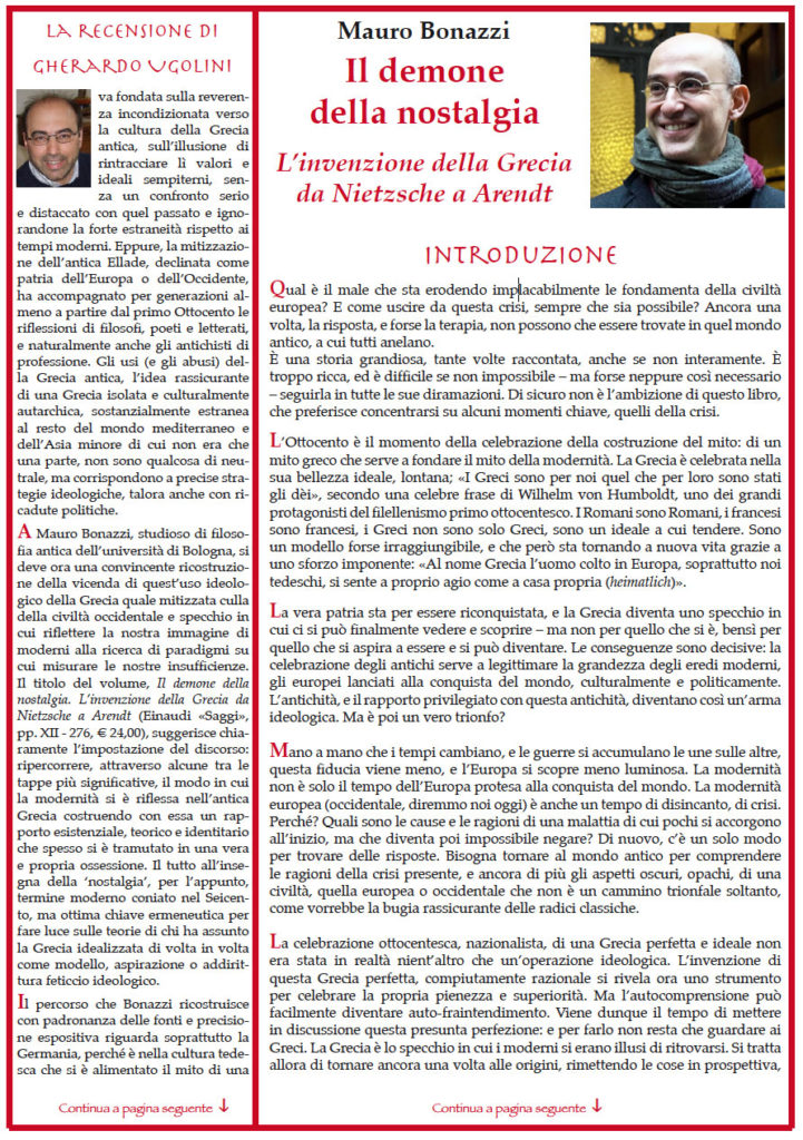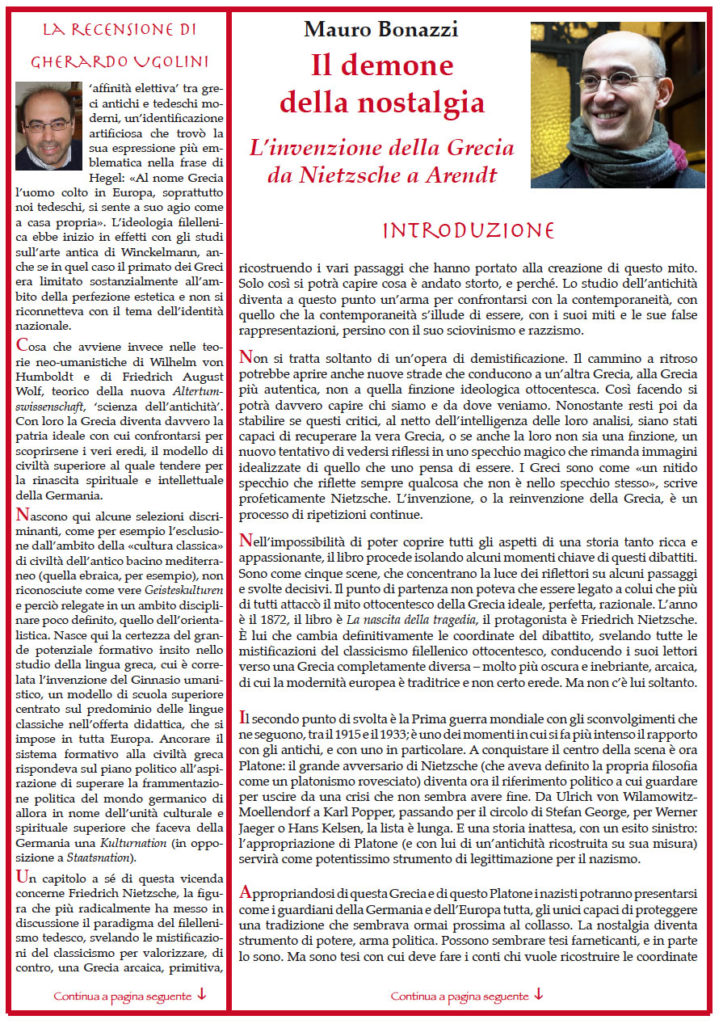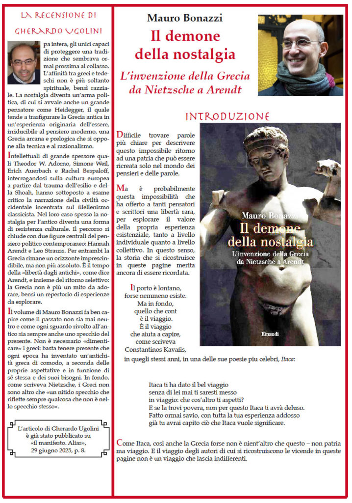 Mauro Bonazzi – «Il demone della nostalgia. L’invenzione della Grecia da Nietzsche a Arendt». Difficile trovare parole più chiare di quelle usate da Nietzsche per descrivere l’impossibile ritorno ad una patria che può essere ricreata solo nel mondo dei pensieri e delle parole. Ma è probabilmente questa impossibilità che ha offerto a tanti pensatori e scrittori una libertà rara, per esplorare il valore della propria esperienza esistenziale. In questo senso, la storia che si ricostruisce in queste pagine merita ancora di essere ricordata. Il porto è lontano, forse nemmeno esiste. Ma in fondo, quello che conta è il viaggio. È il viaggio che aiuta a capire, come scriveva Kavafis, in quegli stessi anni, in una delle sue poesie più celebri, Itaca. – // – Con la recensione di Gherardo Ugolini : “Il mito della civiltà occidentale e gli abusi di un’appropriazione”. Da Nietzsche a Hegel a Humboldt a Wolf ad Arendt e a Leo Strauss.