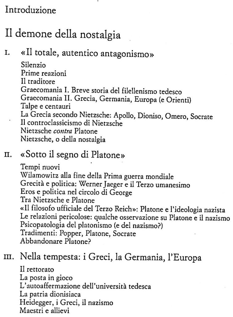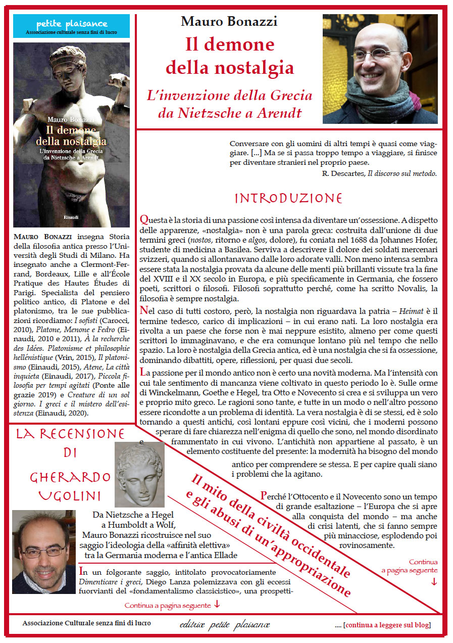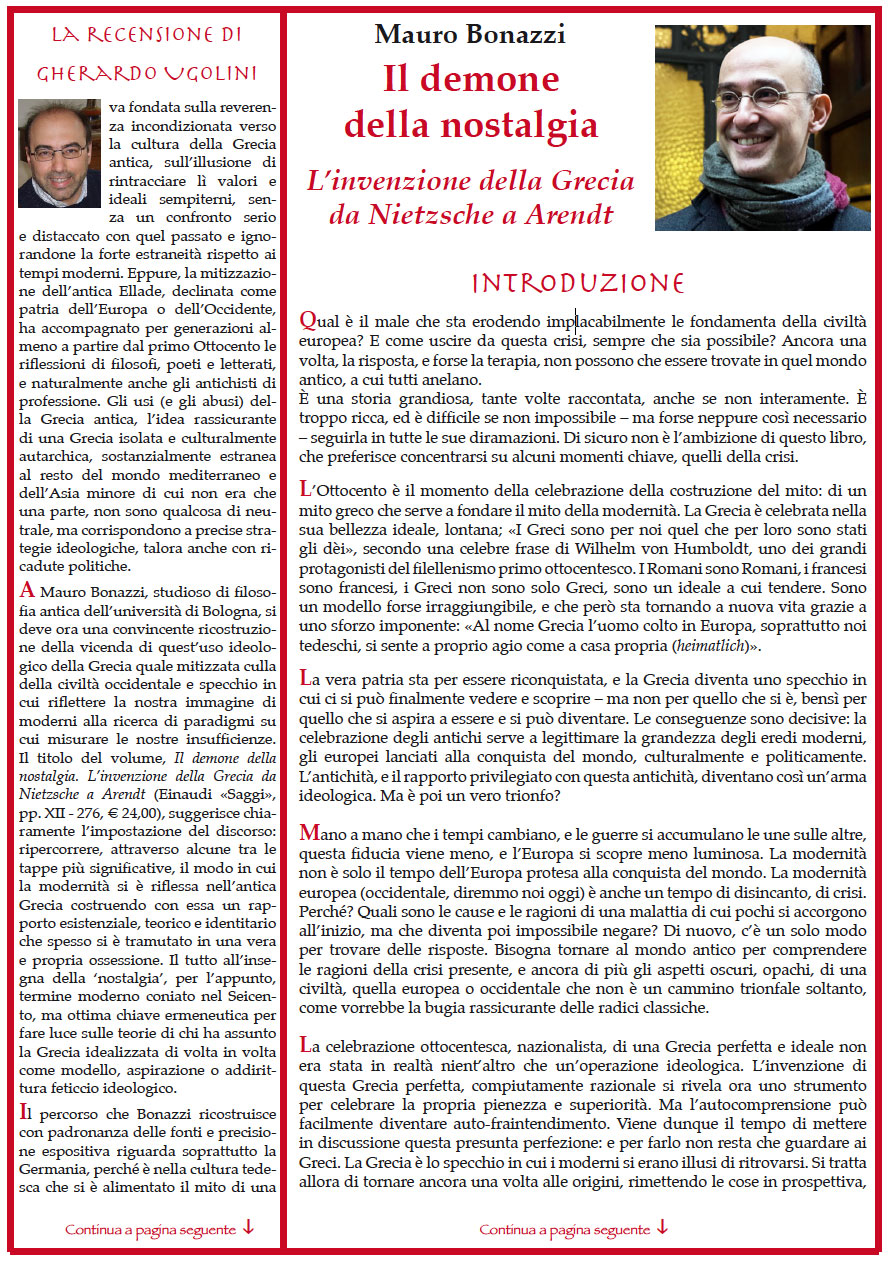 Mauro Bonazzi – «Il demone della nostalgia. L’invenzione della Grecia da Nietzsche a Arendt». Difficile trovare parole più chiare di quelle usate da Nietzsche per descrivere l’impossibile ritorno ad una patria che può essere ricreata solo nel mondo dei pensieri e delle parole. Ma è probabilmente questa impossibilità che ha offerto a tanti pensatori e scrittori una libertà rara, per esplorare il valore della propria esperienza esistenziale. In questo senso, la storia che si ricostruisce in queste pagine merita ancora di essere ricordata. Il porto è lontano, forse nemmeno esiste. Ma in fondo, quello che conta è il viaggio. È il viaggio che aiuta a capire, come scriveva Kavafis, in quegli stessi anni, in una delle sue poesie più celebri, Itaca. – // – Con la recensione di Gherardo Ugolini : “Il mito della civiltà occidentale e gli abusi di un’appropriazione”. Da Nietzsche a Hegel a Humboldt a Wolf ad Arendt e a Leo Strauss.